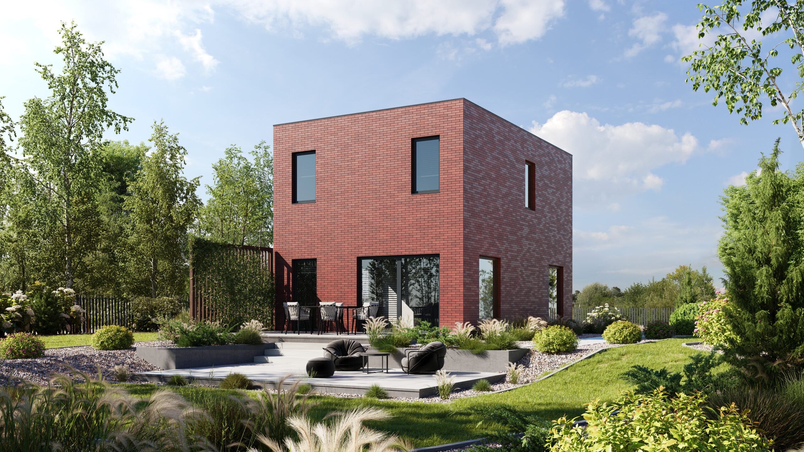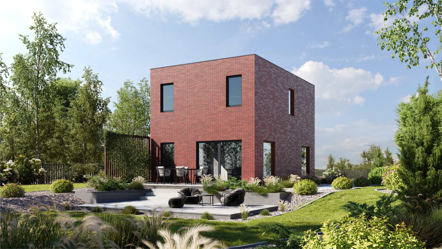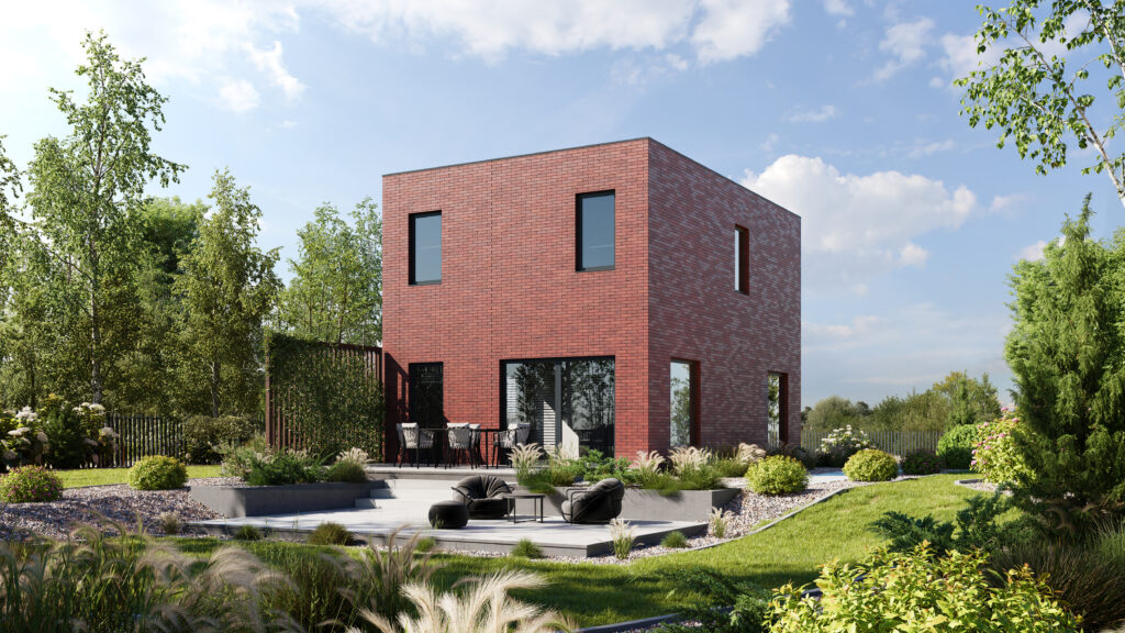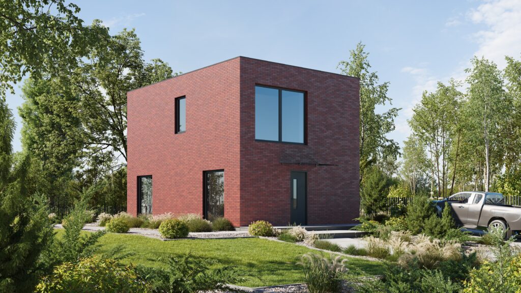 Nowoczesny dom o minimalistycznej bryle i eleganckim wykończeniu z cegły, idealny dla osób ceniących prostotę i funkcjonalność. Przemyślany układ przestrzeni zapewnia komfort codziennego życia, a duże przeszklenia pozwalają cieszyć się naturalnym światłem o każdej porze dnia.